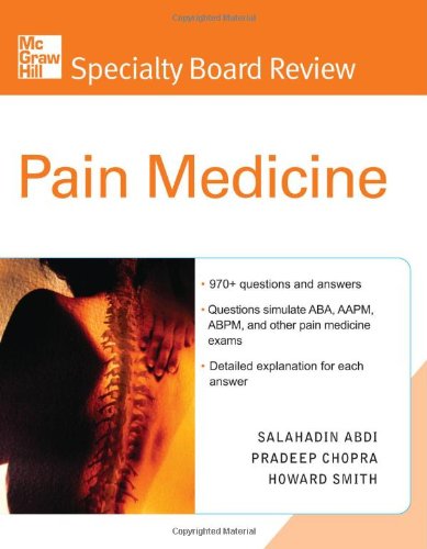 Editorial Review Product Description 1000 Q&As provide the preparation you need to ace the pain medicine board exams and anesthesiology recertification! "The book is meant for all physicians who are practicing interventional pain medicine. It is certainly a very helpful book for any pain fellow getting ready for board examinations....There are other pain review books available...but none as useful as this book is in preparing readers for the pain boards. 3 Stars."--Doody's Review Service McGraw-Hill Specialty Board Review: Pain Medicine is the perfect way to prepare for the American Board of Anesthesiology exam as well as exams given by the American Board of Pain Medicine and the American Academy of Pain Medicine. It's also great for recertification! You'll find everything you need in one comprehensive review . . . questions, answers, explanations, practice tests, and references. Here's why this book is the ultimate anesthesiology board review tool: Customer Reviews (4)