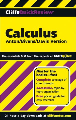 Editorial Review Product Description When it comes to pinpointing the stuff you really need to know, nobody does it better than CliffsNotes. This fast, effective tutorial helps you master core Calculus concepts–from functions, limits, and derivatives to differentials, integration, and definite integrals– and get the best possible grade. At CliffsNotes, we’re dedicated to helping you do your best, no matter how challenging the subject. Our authors are veteran teachers and talented writers who know how to cut to the chase– and zero in on the essential information you need to succeed. Make the grade with CliffsQuickReviews CliffsQuickReviews are available for more than 30 introductory level courses. See inside for a complete listing of these and other bestselling Cliffs titles. Customer Reviews (10)